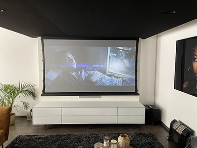 En plus de la toile de projection motorisée, nous avons également fixé un meuble au mur pour créer un espace fonctionnel et moderne. La toile intégrée au plafond avec un tissu tendu assure un design minimaliste tout en conservant des performances optimales. Ce projet offre une vue sur le projecteur et les haut-parleurs arrières, parfaitement intégrés pour une expérience home-cinéma complète et immersive.