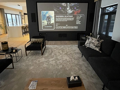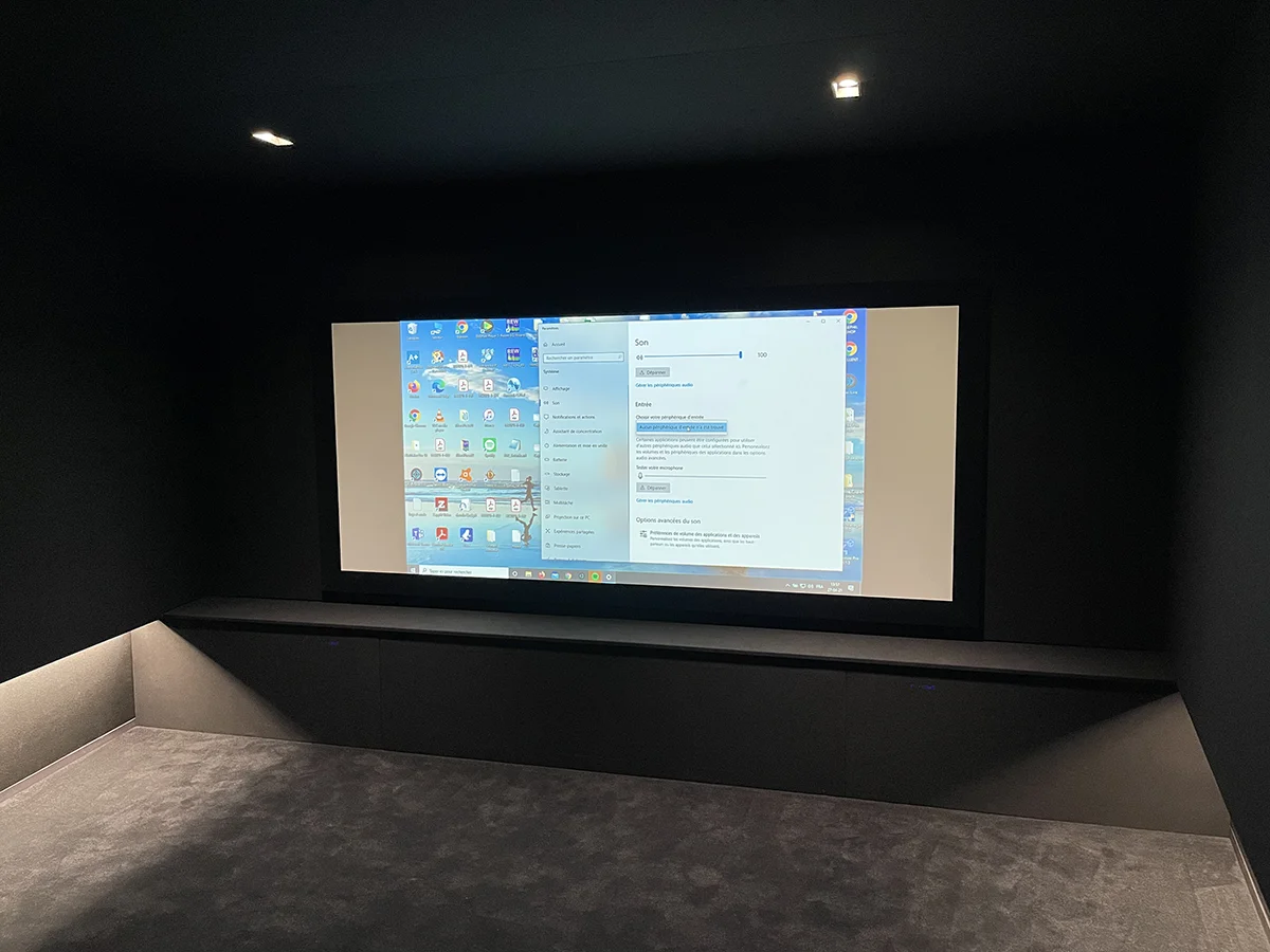 Pour ce projet de salle cinéma dédiée entièrement décorée, nous avons créé une véritable immersion visuelle et sonore. Le plafond a été conçu pour offrir un ciel étoilé, plongeant la salle dans une ambiance à la fois apaisante et spectaculaire. L'éclairage d'ambiance programmable permet de personnaliser les couleurs et l'intensité lumineuse pour chaque session cinéma.