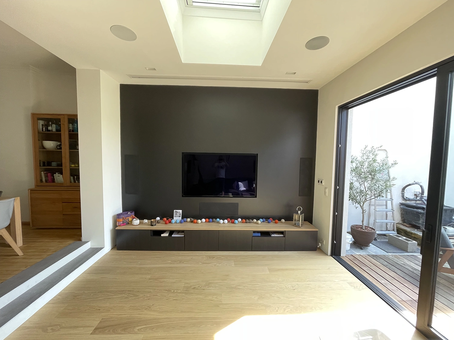 Dans le cadre de la refonte complète de ce salon Home-Cinéma, nous avons créé un espace à la fois performant et discret. La pièce est désormais équipée d'un système 5.1.4, avec une toile de projection encastrée dans le plafond, offrant une expérience visuelle immersive tout en préservant l'esthétique de la pièce.