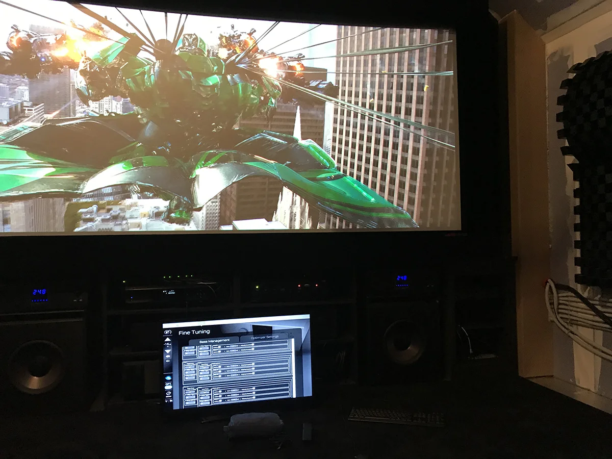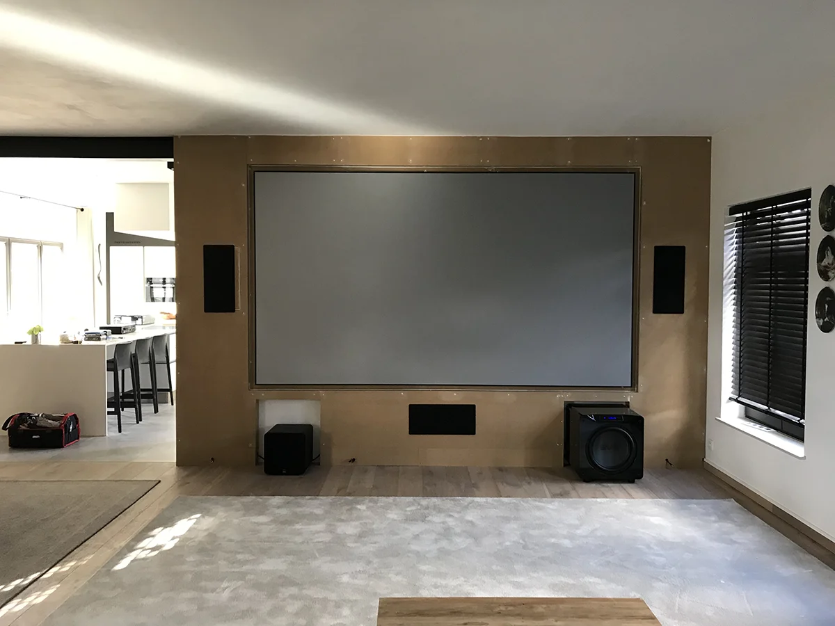 Pour garantir une finition impeccable, l'ensemble du dispositif a été recouvert d'un tissu acoustique, offrant un rendu propre et lisse. Ce salon 5.1.4 intègre à la fois un téléviseur et une toile de projection, avec des écrans et haut-parleurs encastrés pour maximiser l'espace et optimiser le son.